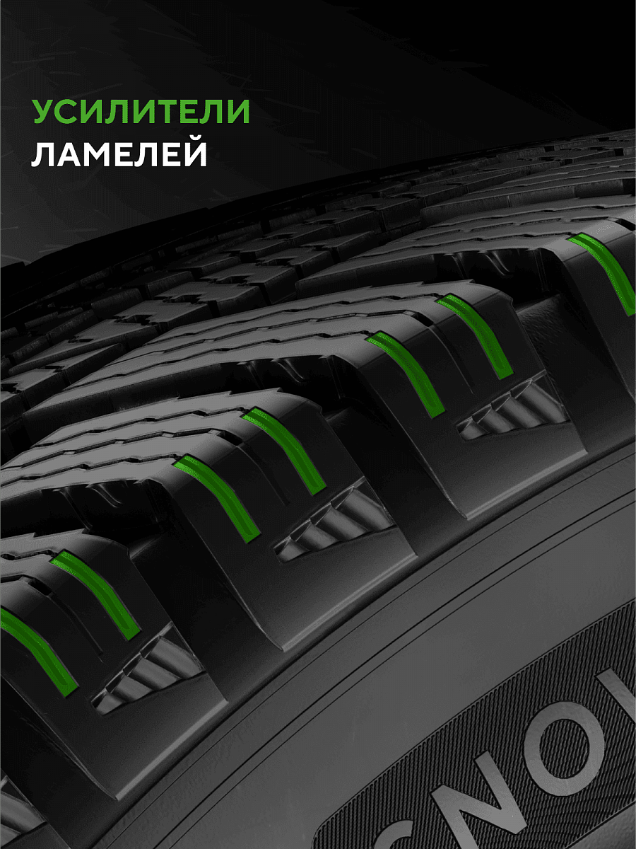 Улучшенное сцепление на скользких дорогах достигается за счет добавления в резиновую смесь мельчайших частиц с острыми гранями, которые проявляются на протекторе по мере износа. Отличная управляемость на льду и снегу.